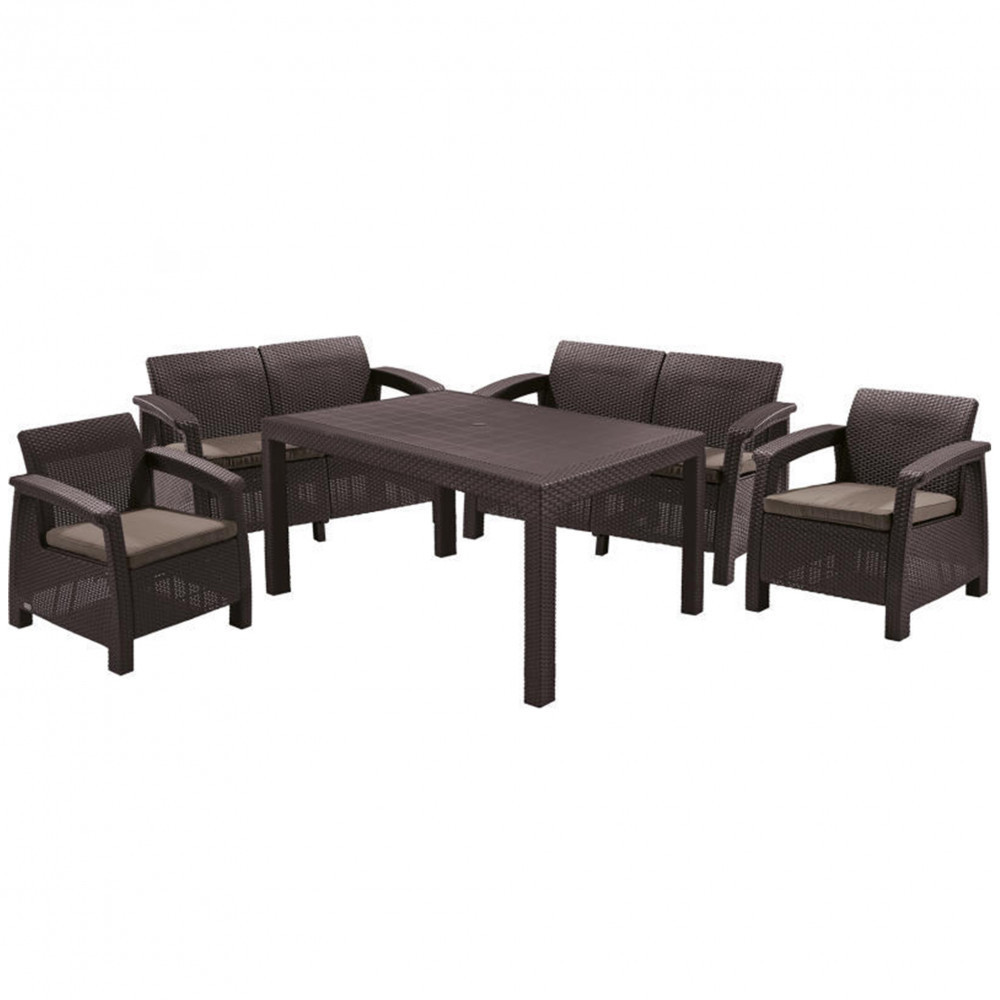 A Corfu Fiesta bútor szett felülete rattant imitáló anyagból készült. A szett két fotelt, két darab kétszemélyes kanapét és egy nagy négyszögletes asztalt tartalmaz. A szett kiválóan alkalmas étkezésekhez. Tökéletes nagy felületek berendezésére, kiváló családi grill- vagy kerti partik rendezésére. A bútorok tartósak és ellenállnak az időjárás viszontagságainak, valamint az UV sugárzásnak. A Corfu Fiesta elegáns színárnyalatokban kapható. Összeszerelése könnyű, tisztítása egyszerű.
